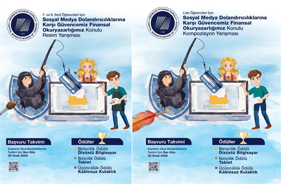 Ortaokul ve lise öğrencisi gençlerin finansal okuryazarlık konusunda farkındalık ve bilinç düzeyinin arttırılmasını sağlamak, eğitim çağındaki gençlerde tasarruf ve yatırım bilincini geliştirmek ve finansal kurumları tanıtmak amacıyla Milli Eğitim Bakanlığı’nın onayı ile Sermaye Piyasası Kurulu tarafından “Sosyal Medya Dolandırıcılıklarına Karşı Güvencemiz Finansal Okuryazarlığımız” konulu ortaokul 7. ve 8. sınıf öğrencilerine yönelik “Resim Yarışması” ile lise öğrencilerine yönelik “Kompozisyon Yarışması” düzenlenecektir.